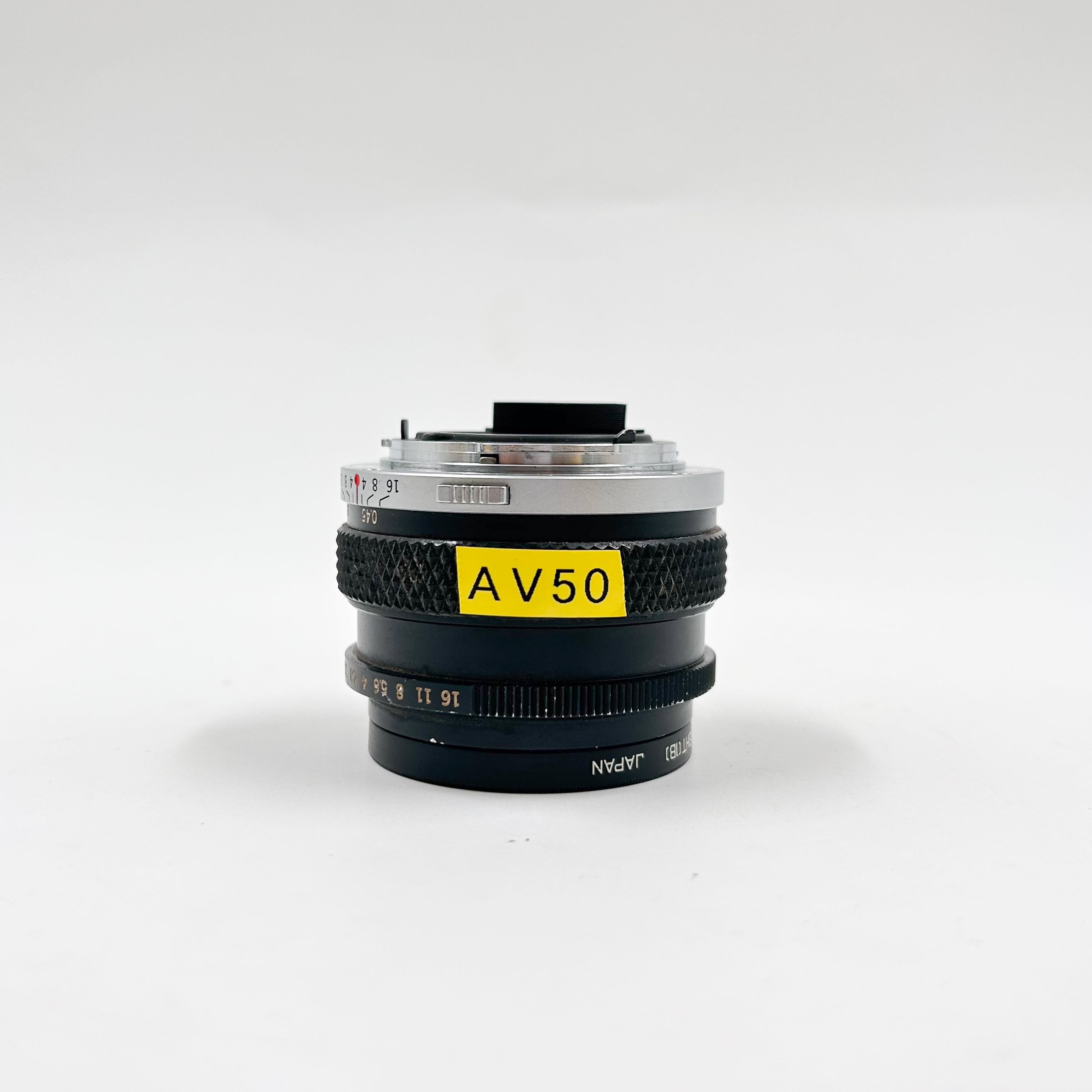 The Olympus F.Zuiko 50mm (AV50) has been inspected by CPB Darkroom. The lens is in good working condition, with smooth focusing and responsive aperture blades. There are traces of fungus in the rear element and minor dust inside, neither of which appear to significantly impact practical image quality. Cosmetically, the lens is in good condition with minimal signs of use. The images shown depict the exact lens you will receive.