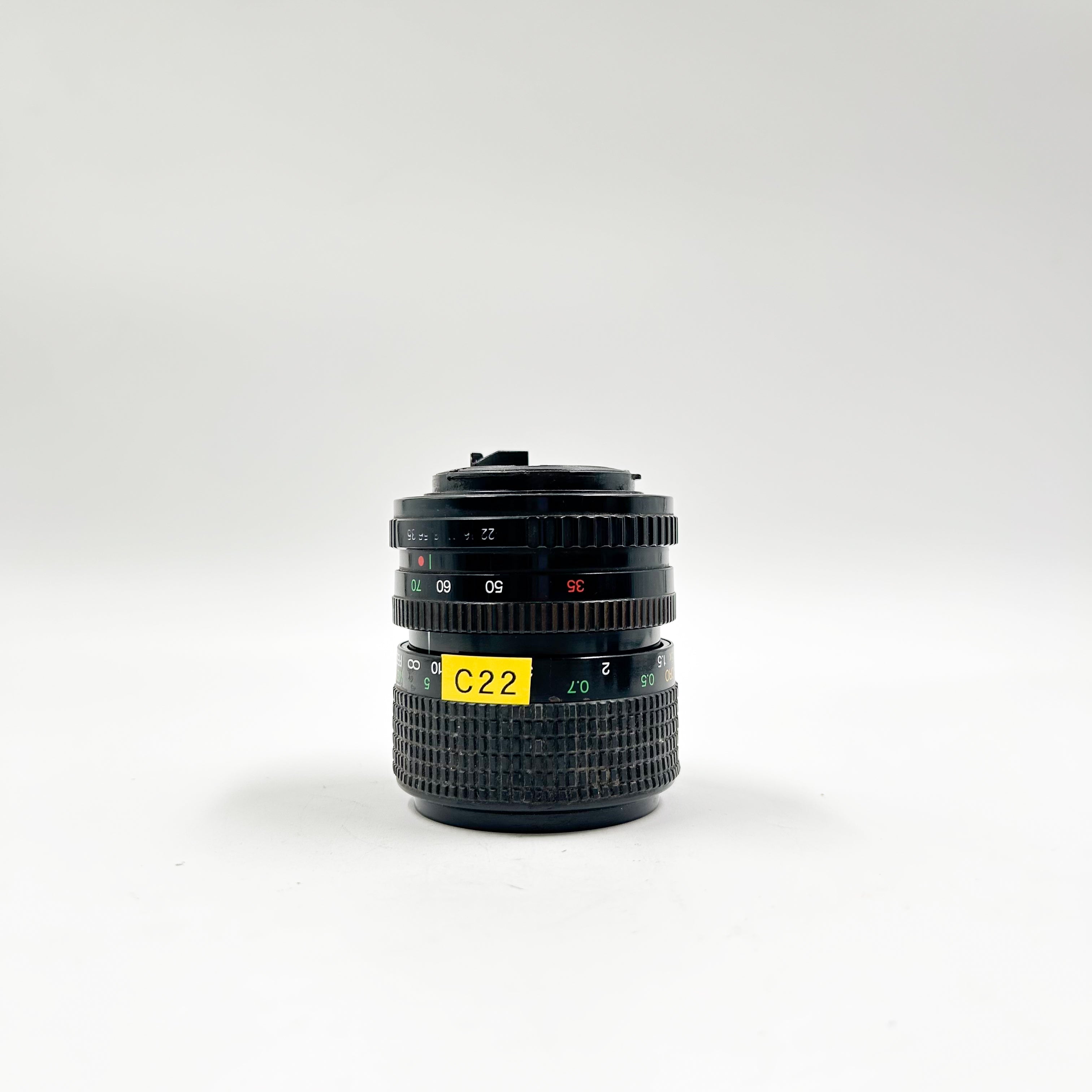 Compact and versatile, this Cosina 35–70mm lens covers a useful range from wide to short telephoto and includes a macro function for close-up work. Known for its lightweight design and good optical performance at mid-apertures.