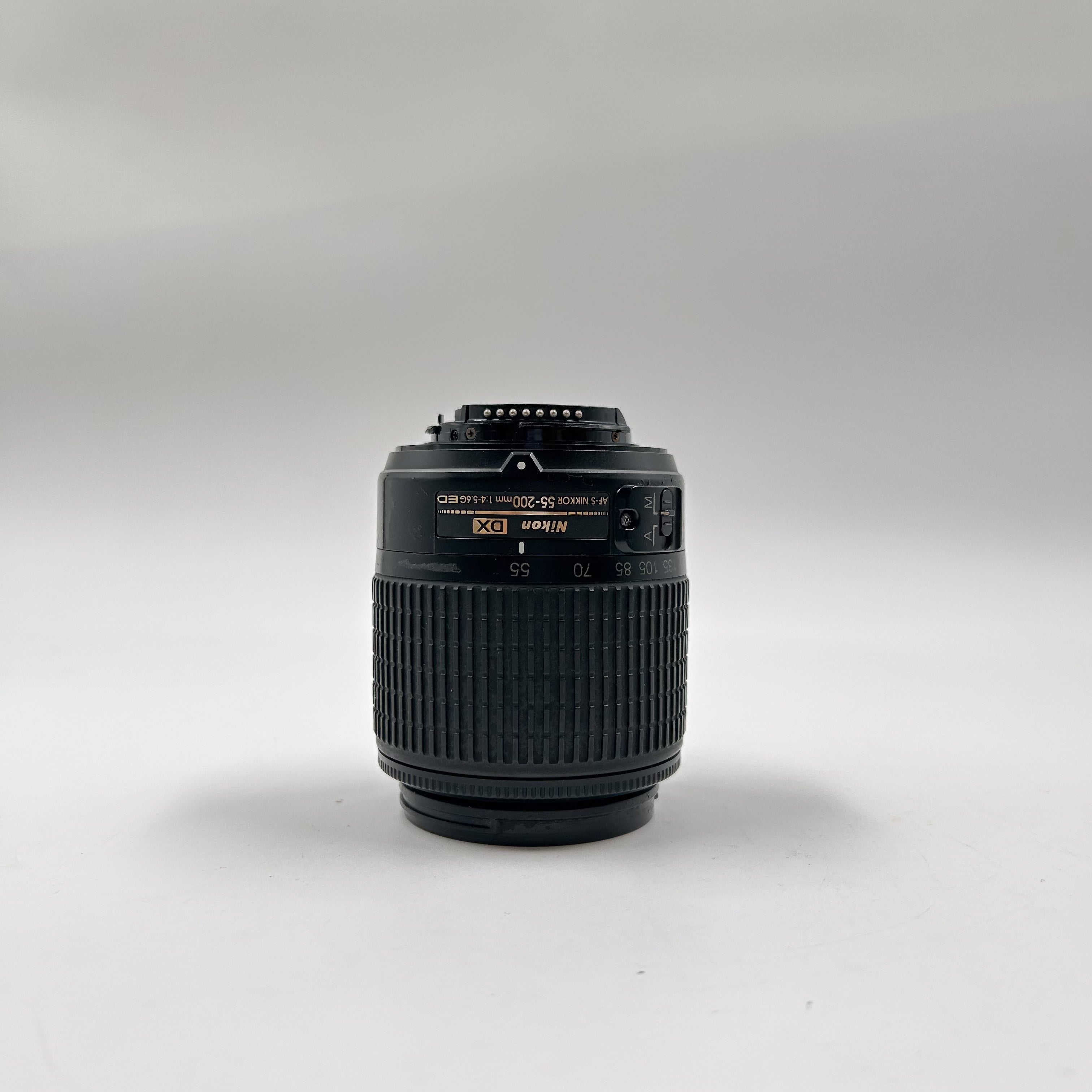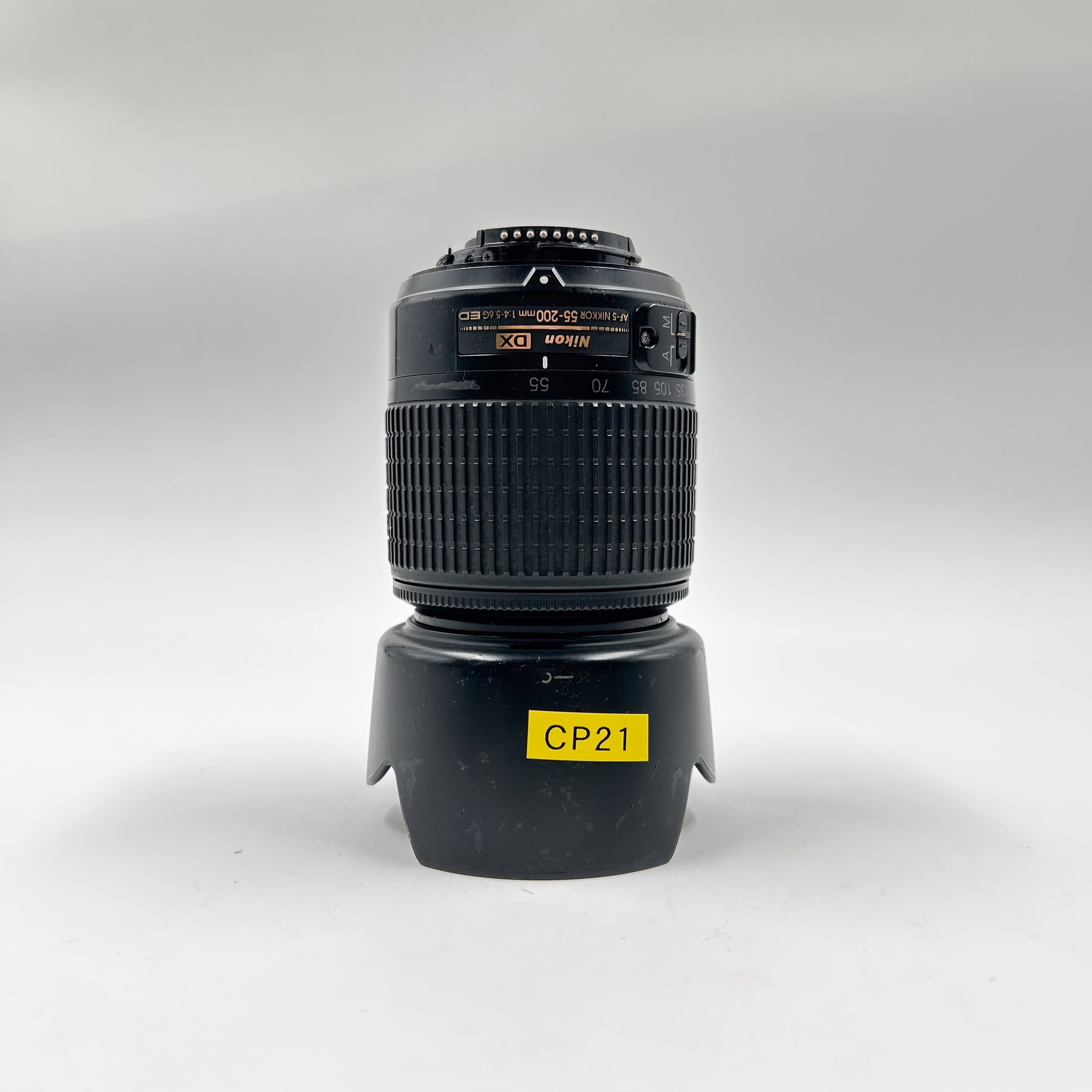 The Nikkor AF-S DX 55–200mm f/4–5.6 (CP21) has been inspected by CPB Darkroom. The zoom and focus rings operate smoothly, and the aperture mechanism is functioning correctly. The lens contains visible internal dust and would benefit from cleaning, though it remains mechanically sound. Cosmetically, it is in good condition with typical signs of use. The images shown depict the exact lens you will receive.