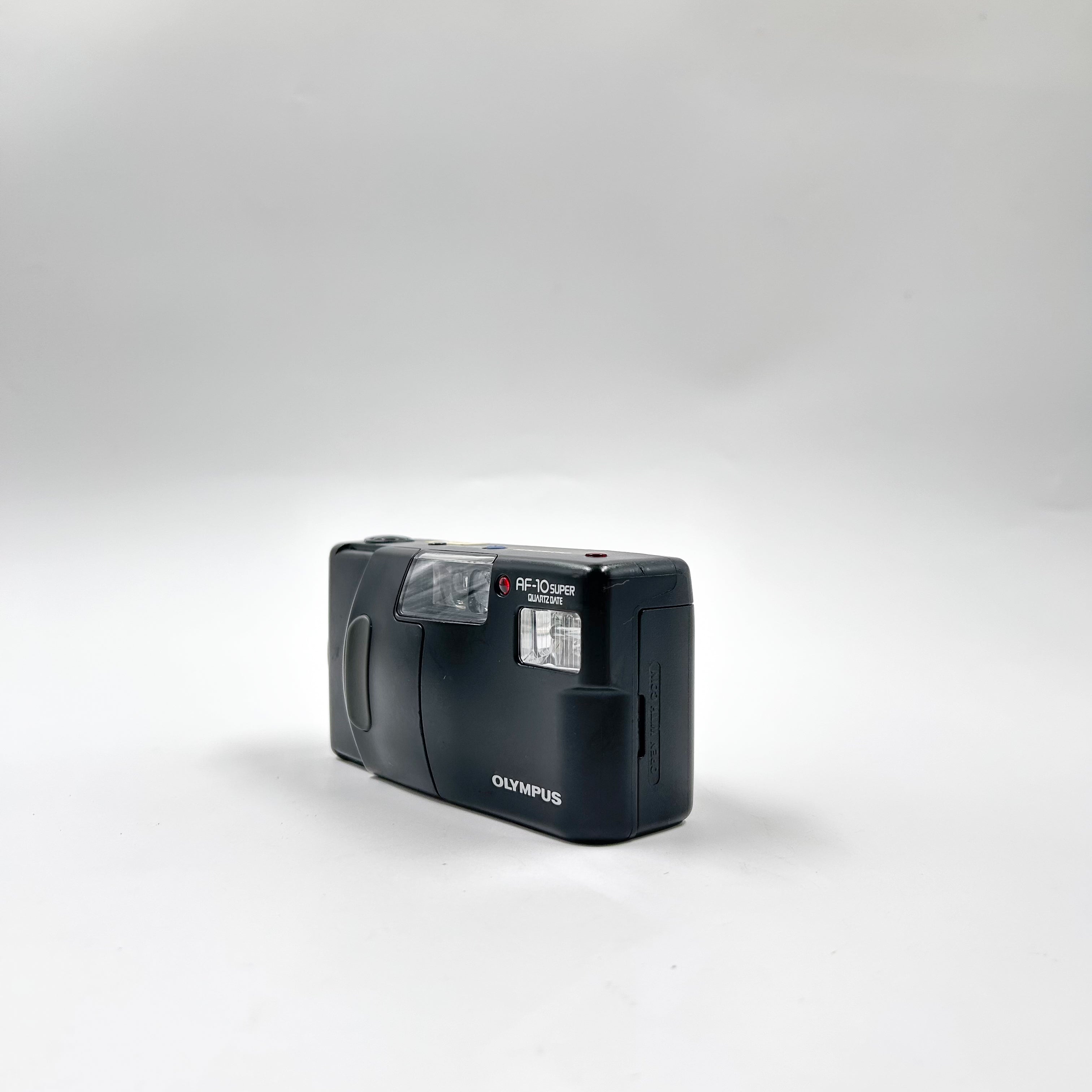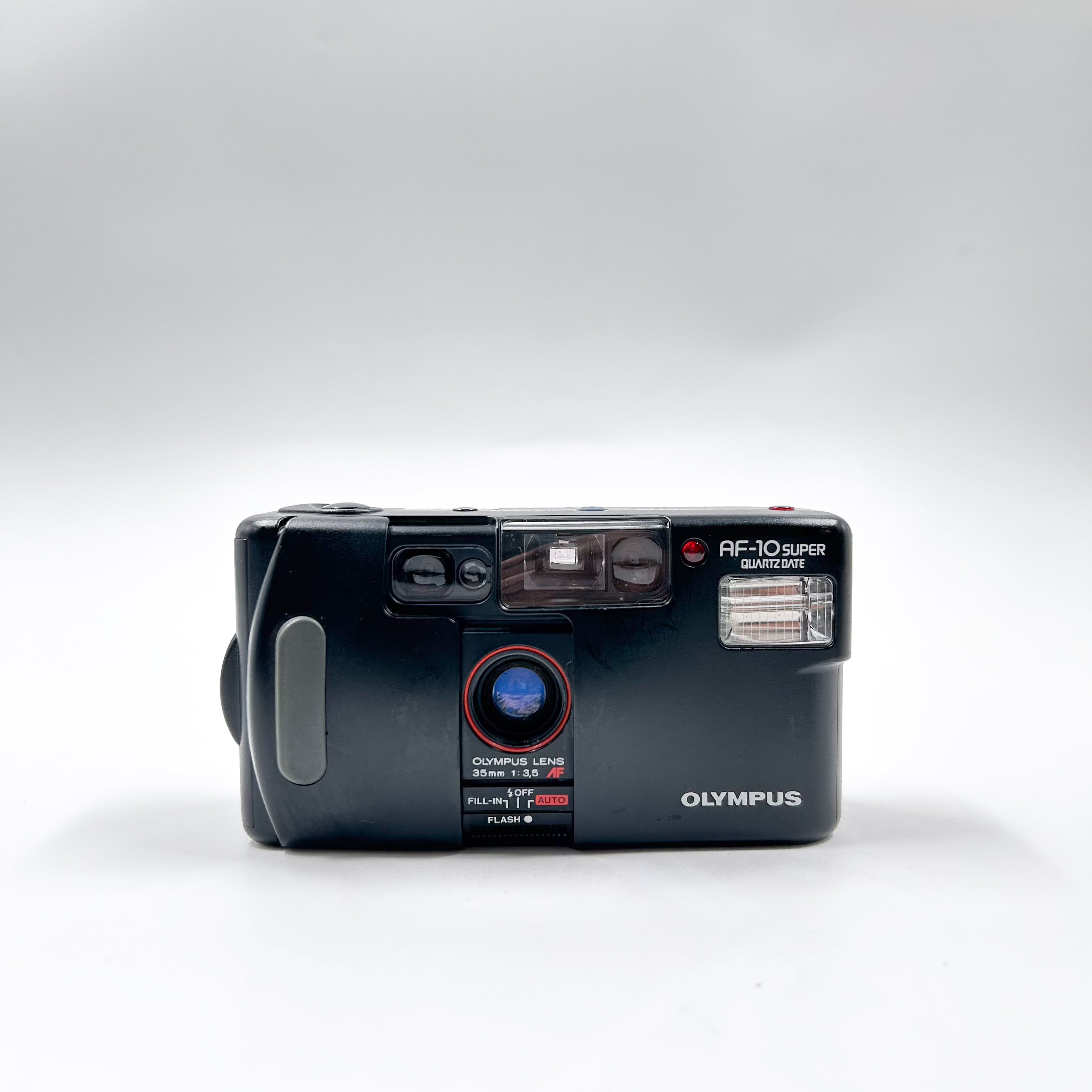 Introduced in the early 1990s, the Olympus AF-10 Super Quartz Date is a fully automatic compact camera equipped with a sharp 35 mm f/3.5 lens, built-in flash, and a quartz date back for imprinting time and date on negatives. Compact, lightweight, and easy to operate, it’s ideal for travel, street, or everyday snapshots.